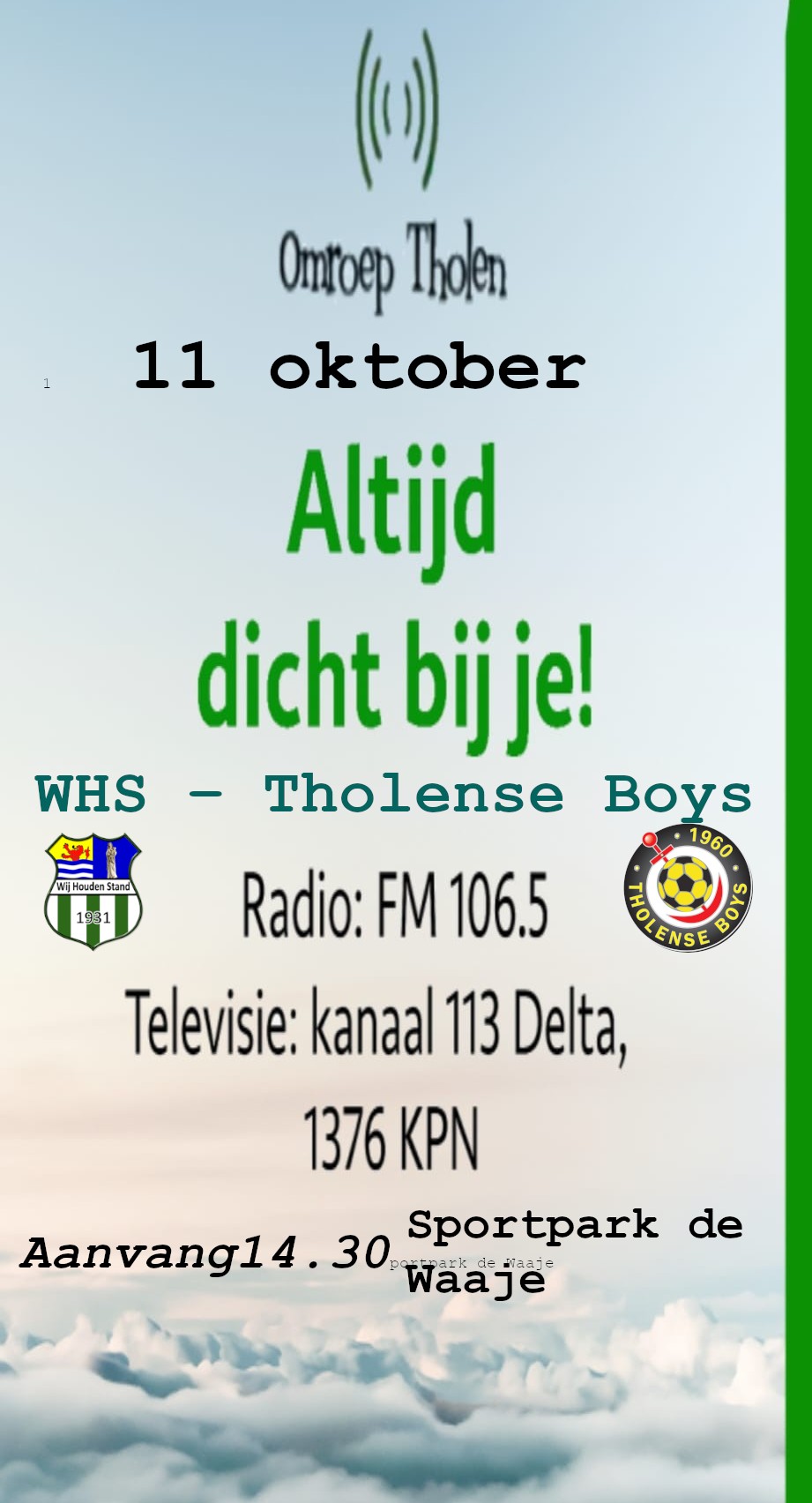 Net als bij de bekerwedstrijd tegen THB wordt de competitiewedstrijd aanstaande zaterdag op veler verzoek uitgezonden op zowel de radio (FM 106.5) als televisie ( kanaal 113 Delta, 1376 KPN) bij Omroep Tholen. Mooiste is natuurlijk dat je als supporter langs de lijn staat. Kom naar de eilandelijke “kraker” WHS – THB deze start om 14.30 op sportpark de Waajje in Sint Annaland.